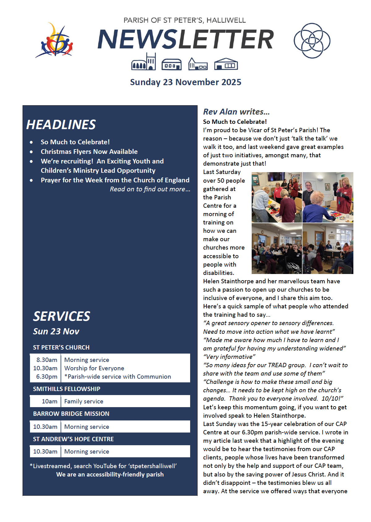 Last Sunday was the 15-year celebration of our CAP Centre at our 6.30pm parish-wide service. I wrote in my article last week that a highlight of the evening would be to hear the testimonies from our CAP clients, people whose lives have been transformed not only by the help and support of our CAP team, but also by the saving power of Jesus Christ. And it didn’t disappoint – the testimonies blew us all away. At the service we offered ways that everyone can be involved supporting the amazing work of our CAP Centre – speak to Sam Wolstencroft if you’d like to get involved and watch out for the requests that are often posted in this newsletter.