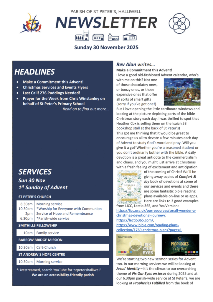 We’ll be giving away copies of Comfort & Joy book of devotions at some of our services and events and there are some fantastic bible reading plans available on-line or as apps. Here are links to 3 good examples from LICC, Lectio 365, and YouVersion: