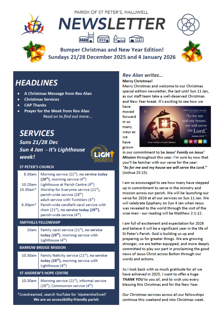 Merry Christmas and welcome to our Christmas special edition newsletter, the last until Sun 11 Jan, as our staff team take a well-deserved Christmas and New Year break. It’s exciting to see how we have moved forward in so many ways as we have grown in our commitment to be Jesus’ Family on Jesus’ Mission throughout this year. I’m sure by now that you’ll be familiar with our verse for the year: “As for me and my house we will serve the Lord.” (Joshua 25:15).
