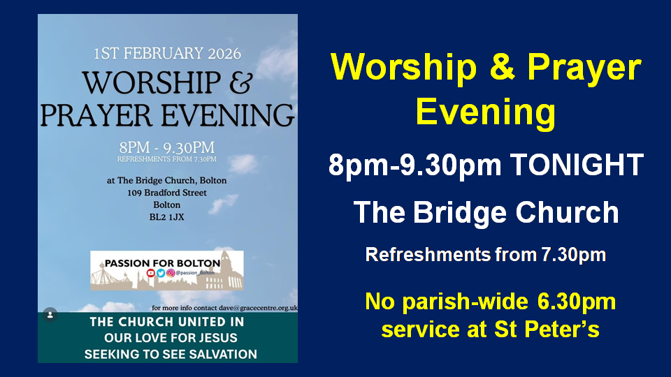 On this Sunday evening, we are all invited to join Christians from churches across Bolton for a Worship & Prayer Evening at The Bridge Church, 109 Bradford Street BL2 1JX.