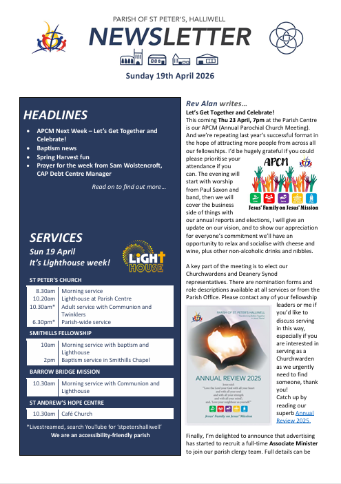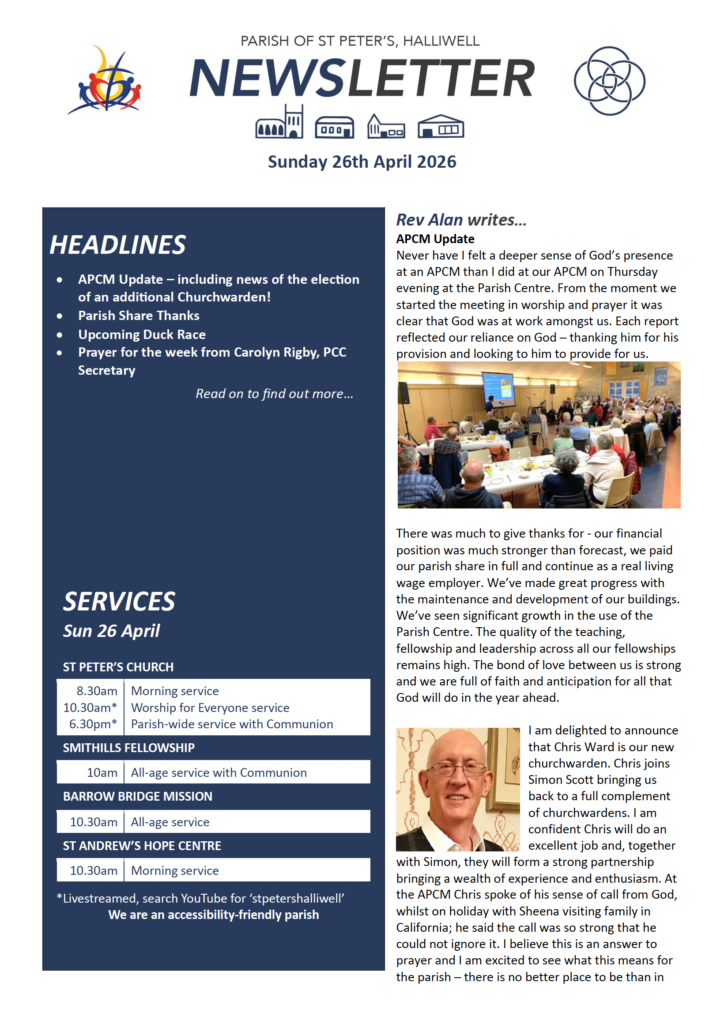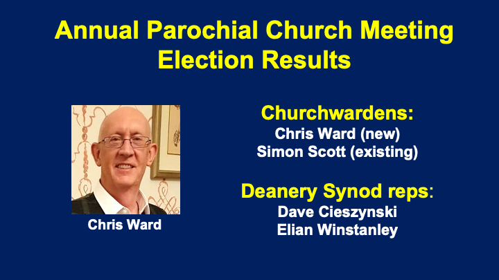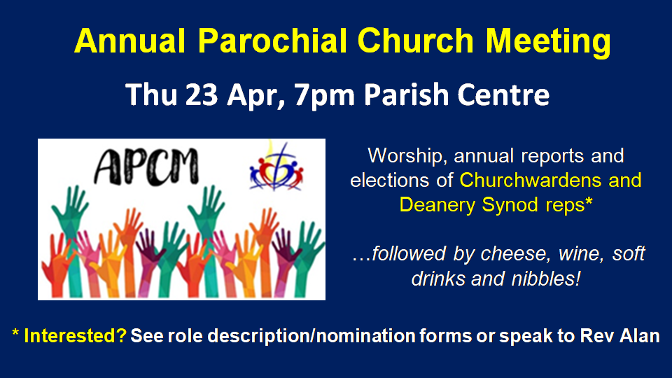 This coming Thu 23 April, 7pm at the Parish Centre is our APCM (Annual Parochial Church Meeting).